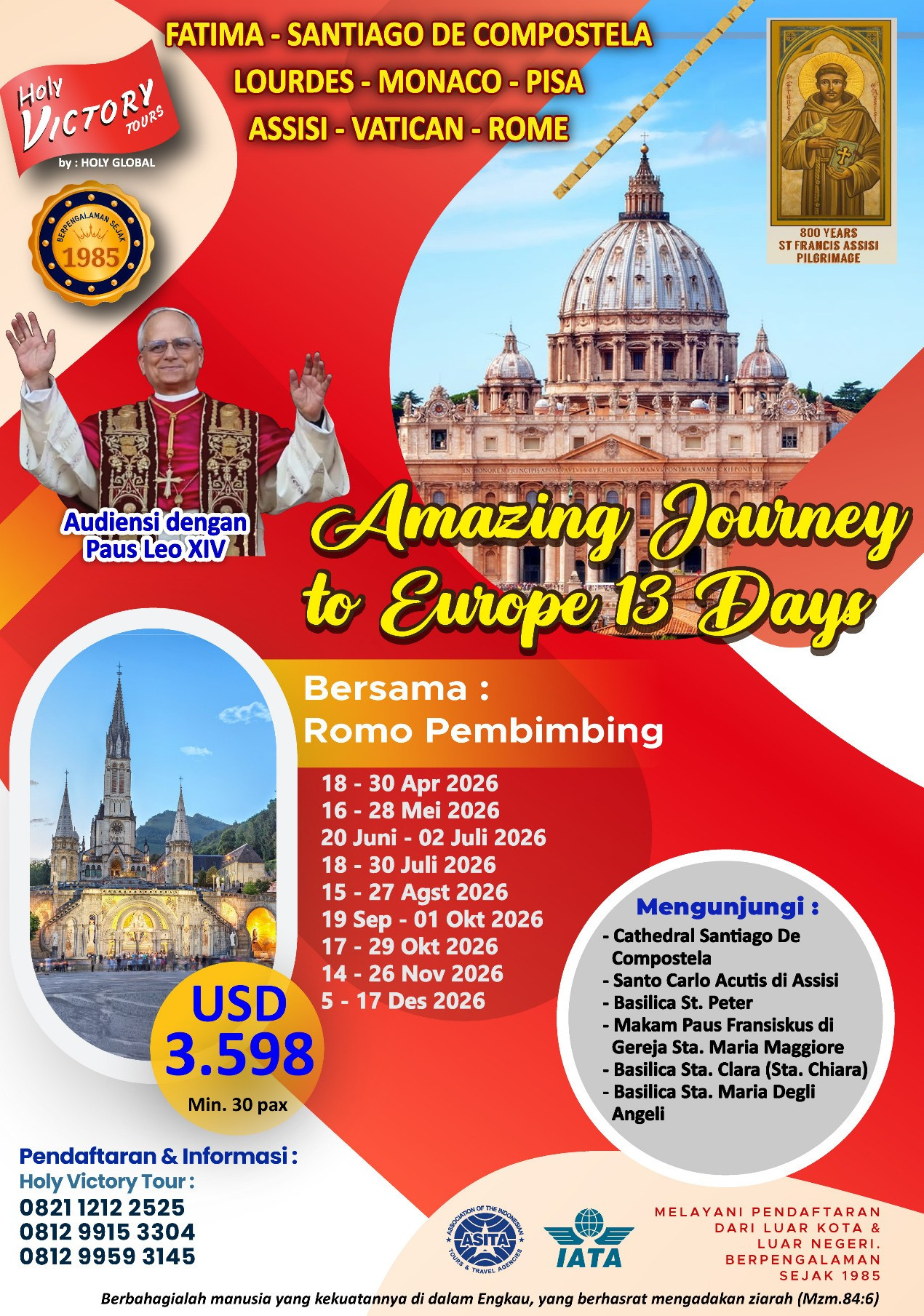 Hari ini kita diajak ke Vatican untuk Audiensi dengan Paus Leo XIV (Apabila Paus berada di tempat) di Bassilica St. Peter. Kemudian kita akan mengunjungi Basilica St. Paul Outside The Walls. Kemudian kita diantar ke Airport untuk penerbangan kembali ke Jakarta.