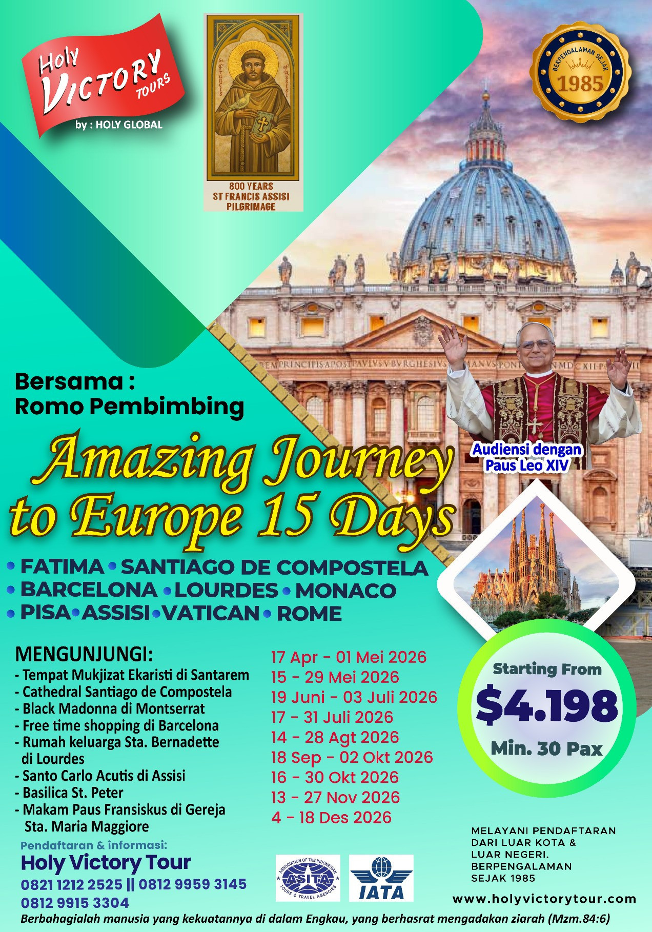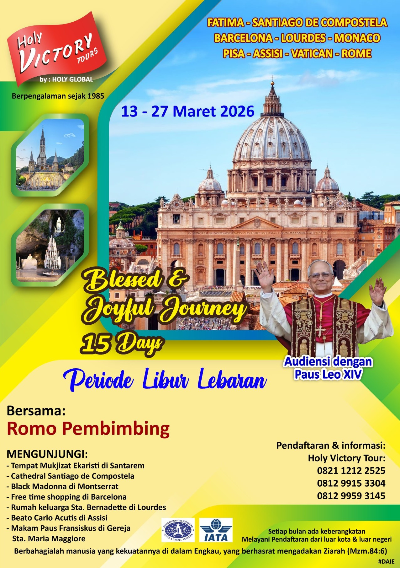 Hari ini kita diajak ke kota Vatican untuk Audiensi dengan PAUS LEO XIV (Apabila Paus berada di tempat), Bassilica St. Peter. Kemudian kita akan Mengunjungi Basilica St. Paul. Setelah itu kita akan Gereja Sta. Maria Maggiore untuk mengunjungi makam Paus Fransiskus. Kemudian kita akan photo stop di Colloseum dan Trevi Fountain yang merupakan simbol kota Rome. Bermalam di Rome.