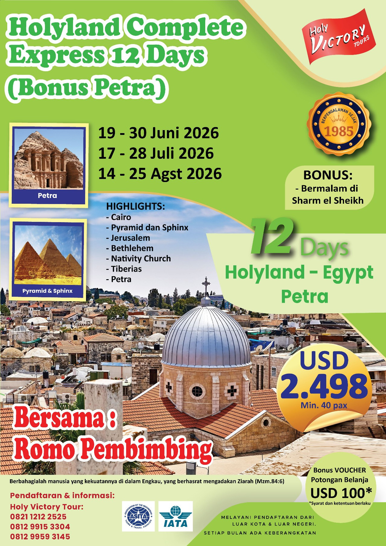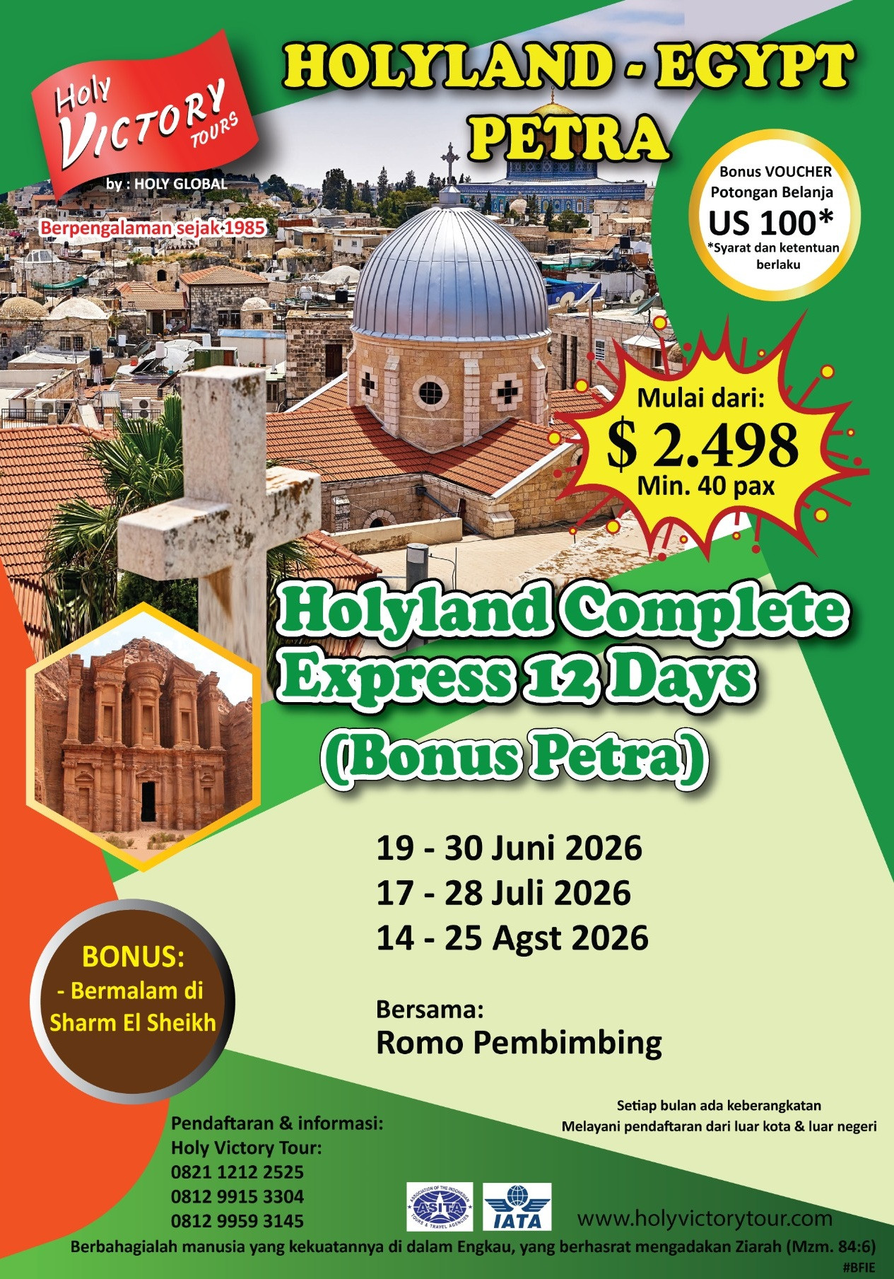 Pagi ini setelah santap pagi, Kita akan mengunjungi Gunung Nebo, tempat Nabi Musa melihat Tanah Perjanjian dari atas gunung dan wafat di sana. Kemudian kita diantar ke Airport Amman untuk penerbangan kembali ke Jakarta.