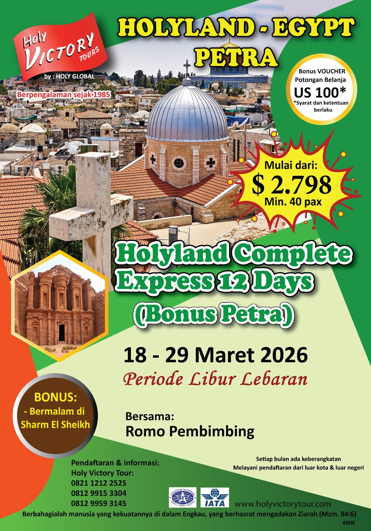 Pagi ini setelah santap pagi, Kita akan mengunjungi Gunung Nebo, tempat Nabi Musa melihat Tanah Perjanjian dari atas gunung dan wafat di sana. Kemudian kita diantar ke Airport Amman untuk penerbangan kembali ke Jakarta.