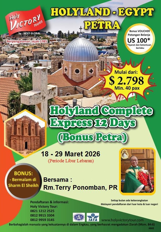 Kita bersyukur untuk kesempatan indah kita terima dari Tuhan, boleh berziarah bersama. Kita berkumpul 3 jam sebelum keberangkatan di Terminal 3 (Gate 3) Bandara Internasional Soekarno-Hatta menuju Amman ibu kota Jordania.
